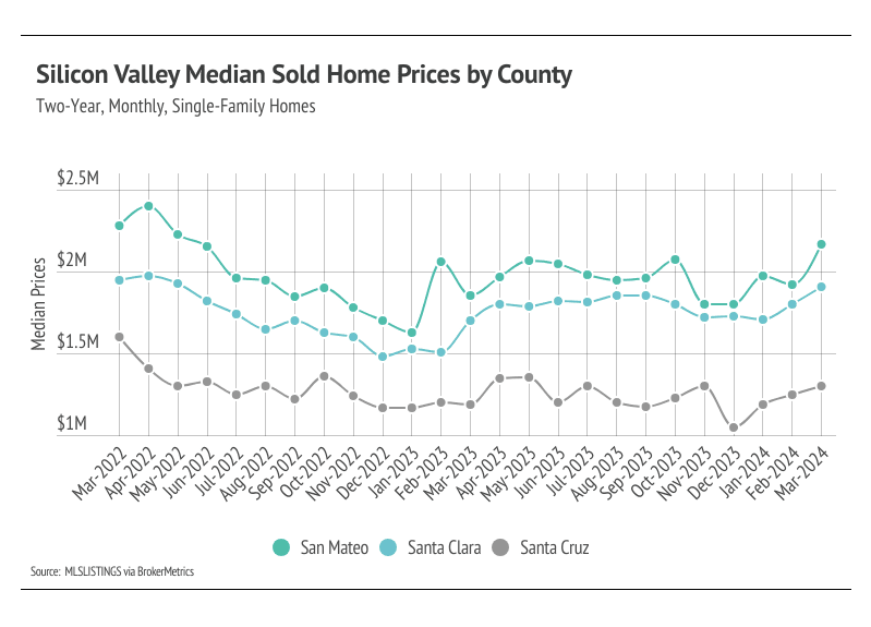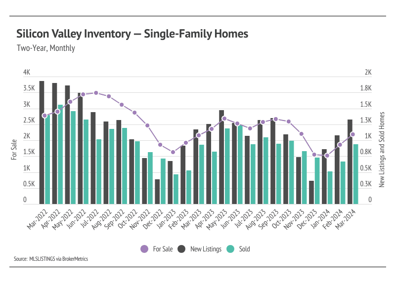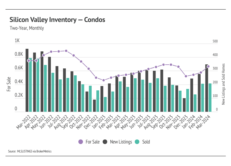 In Silicon Valley, low inventory and high demand have more than offset the downward price pressure from higher mortgage rates, and prices generally haven’t experienced larger drops due to higher mortgage rates. Month over month, in March, the median single-family home price rose 13% in San Mateo, 6% in Santa Clara, and 4% in Santa Cruz. Year over year, prices were also up across markets for single-family homes, up 17% in San Mateo, 12% in Santa Clara, and 9% in Santa Cruz. Condo prices rose across Silicon Valley from February to March as well, with the largest gain in San Mateo, up 5%. We expect prices in Silicon Valley to remain slightly below peak until the early summer, but prices will almost certainly reach new highs in the second quarter of 2024. Low, but rising inventory is only increasing prices as buyers are better able to find the best match.