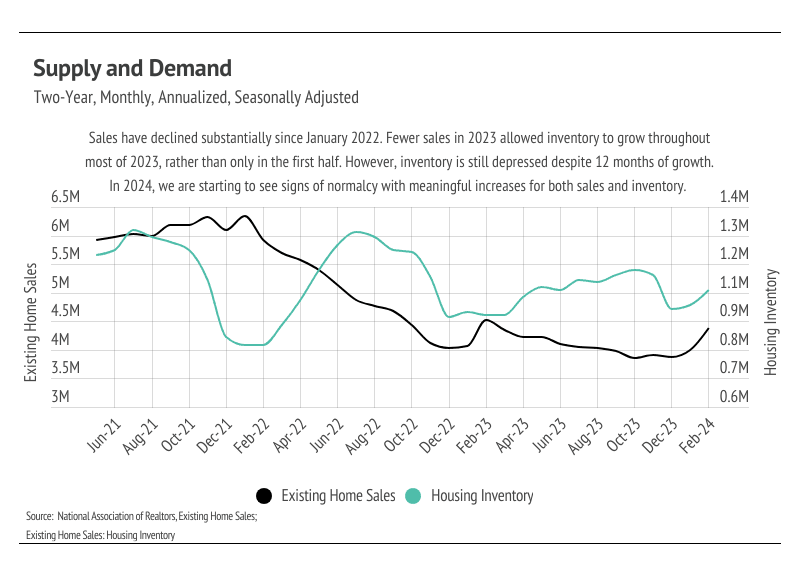 High mortgage rates soften both supply and demand, but at this point rates have been above 6% for 16 months, and rate cuts will likely occur sometime this year. Potential buyers have had longer to save for a down payment and will have the opportunity to refinance in the next 12-24 months, which makes current rates less of a limiting factor. However, high demand can only do so much for the market if there isn’t supply to meet it.