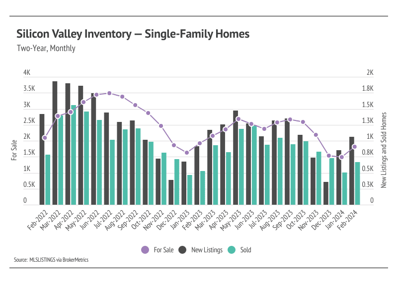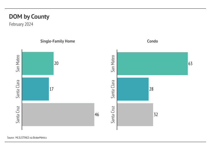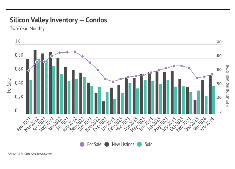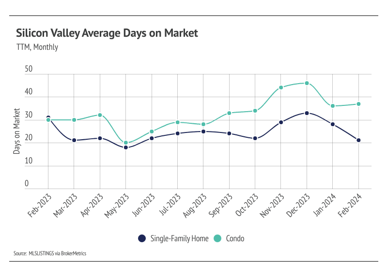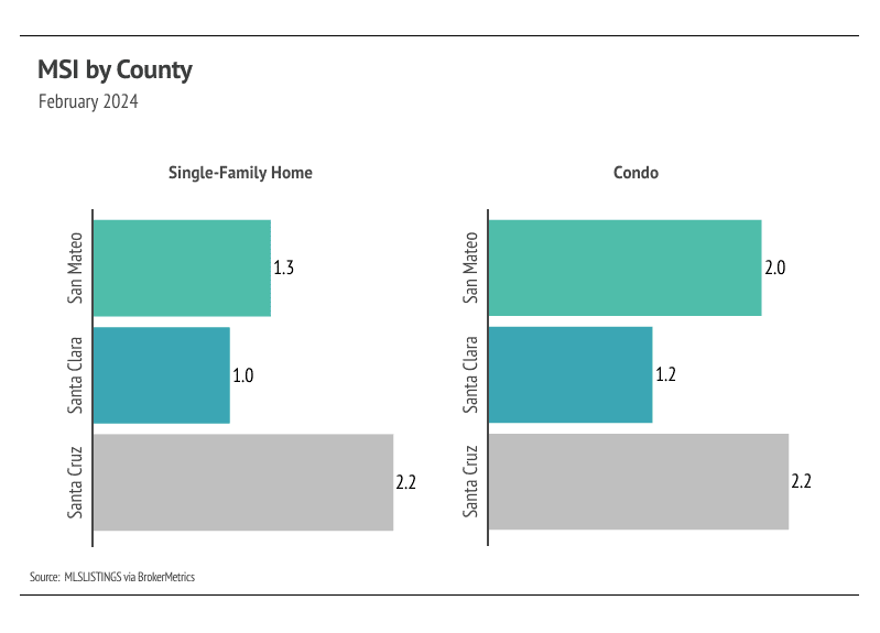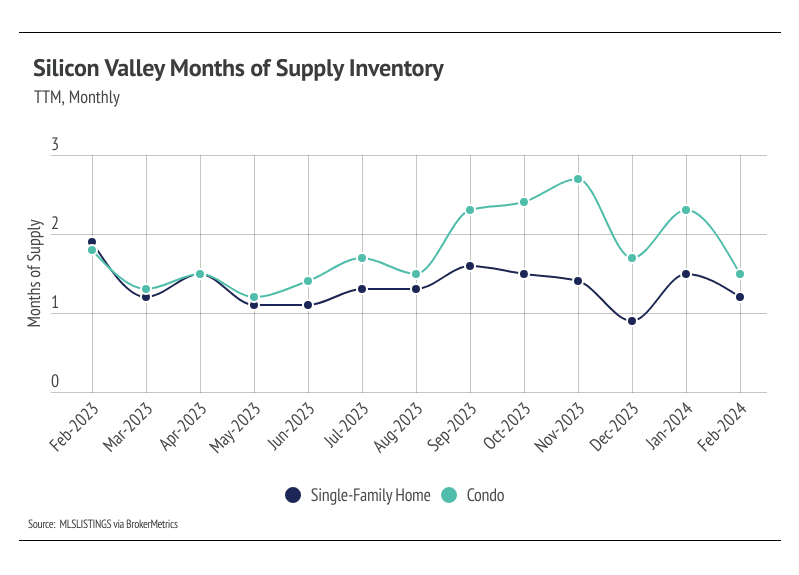 Months of Supply Inventory (MSI) quantifies the supply/demand relationship by measuring how many months it would take for all current homes listed on the market to sell at the current rate of sales. The long-term average MSI is around three months in California, which indicates a balanced market. An MSI lower than three indicates that there are more buyers than sellers on the market (meaning it’s a sellers’ market), while a higher MSI indicates there are more sellers than buyers (meaning it’s a buyers’ market). The Silicon Valley market tends to favor sellers, which is reflected in its low MSI. MSI fell sharply in the first quarter of 2023 before gently trending higher from May to November. In December, MSI declined sharply, but rose again in January. MSI contracted once again in February and currently indicates a sellers’ market for both single-family homes and condos.