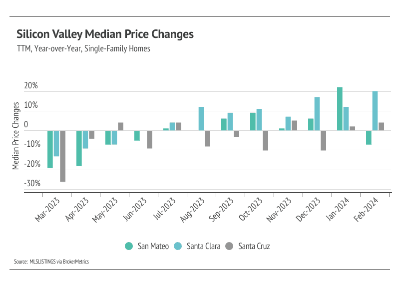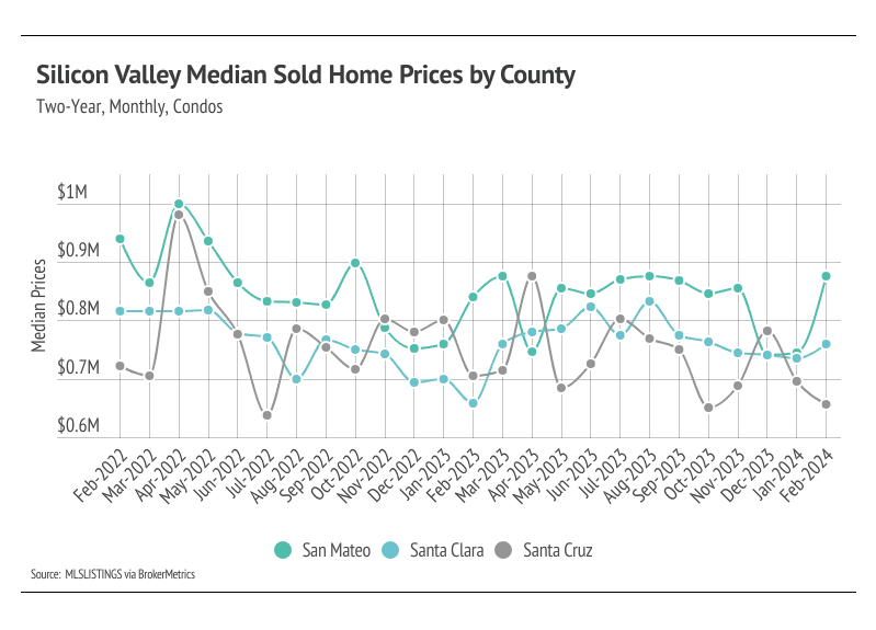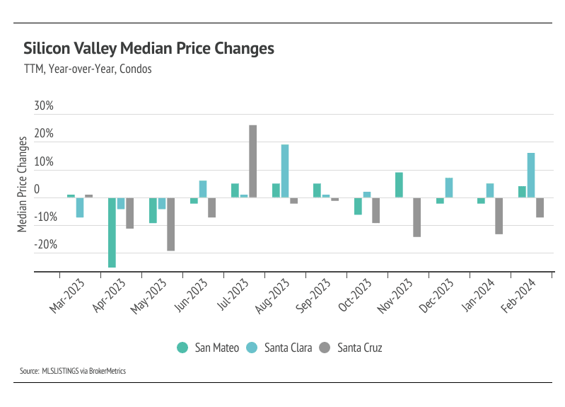 In Silicon Valley, low inventory and high demand have more than offset the downward price pressure from higher mortgage rates, and prices generally haven’t experienced larger drops due to higher mortgage rates. Month over month, in February, the median single-family home price fell 3% in San Mateo, but rose 5% in both Santa Clara and Santa Cruz. However, year over year, prices were down 7% in San Mateo, while Santa Clara and Santa Cruz prices were up 20% and 4%, respectively. Condo prices were mixed across Silicon Valley both month over month and year over year. We expect prices in Silicon Valley to remain slightly below peak until late spring, but as interest rates decline, prices will almost certainly reach new highs in the first half of 2024 with the exception of single-family homes in San Mateo, where prices are far below peak. Additionally, inventory is so low that rising supply will only increase prices as buyers are better able to find the best match.