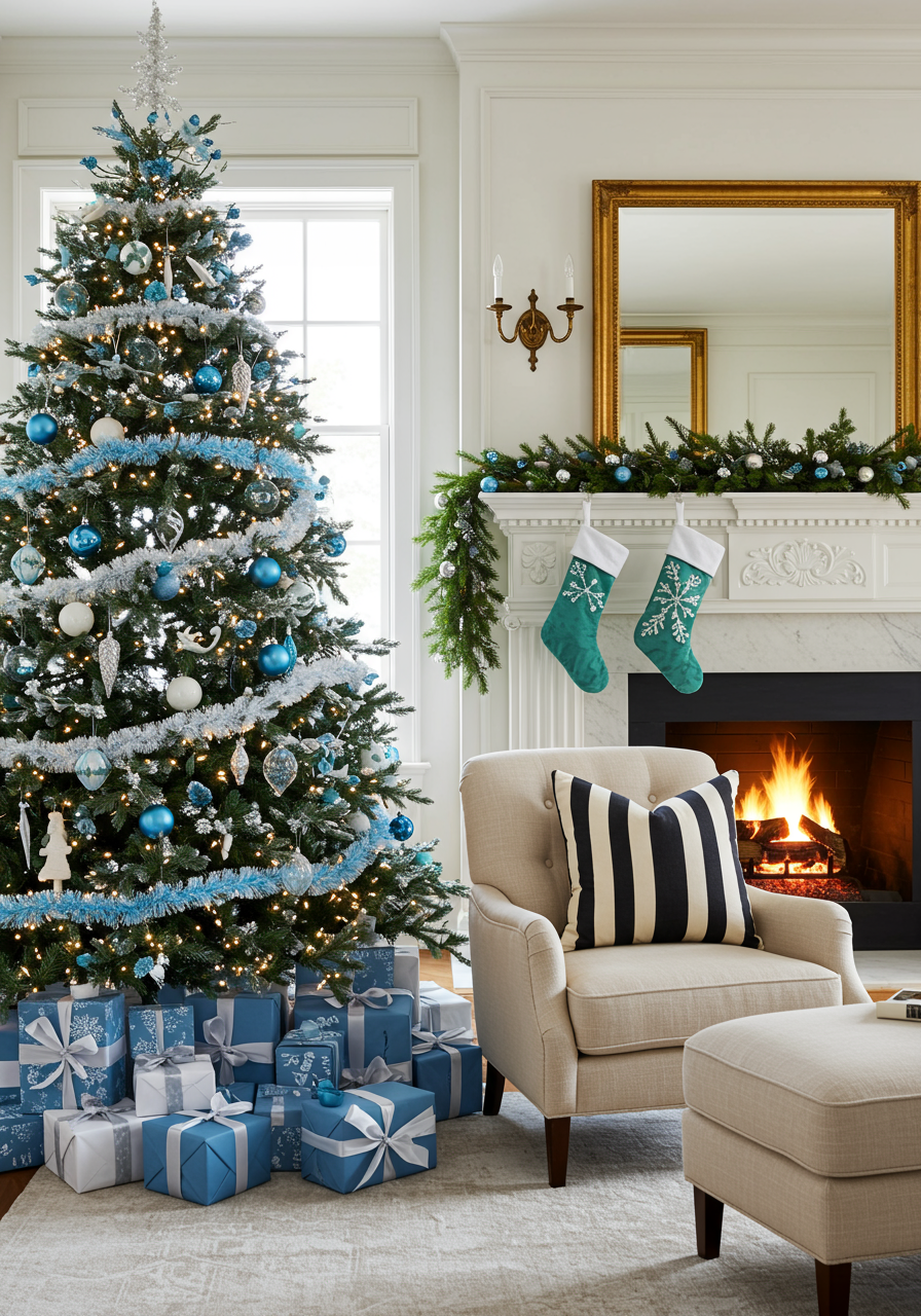 Don’t decorate in red and green because you feel you have to! Though these colors seem like a natural fit for Christmas, there are other options. Metallic glints of silver and gold bring a festive wintery feel to any home. California designer Mark D. Sikes chose to go with a blue-and-white scheme for Christmas. The possibilities are endless!