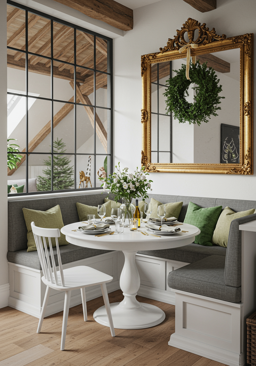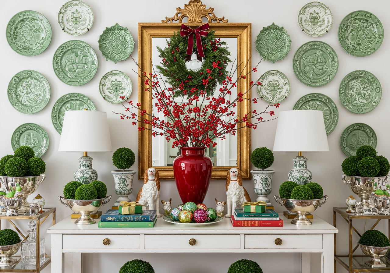 “If you want the fastest way to feeling festive, fill vases with fresh holiday greenery. No flowers, just huge branches of winter greens like cedar and magnolia,” says Texas-based interior designer Denise McGaha. “I also keep rolls of double-faced satin ribbon in platinum or gold on hand for every season and use this to hang wreaths, tie around gifts, hang special ornaments from chandeliers, and create a little holiday glamour.“