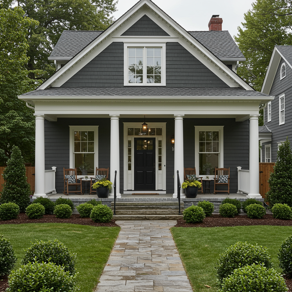 Hannah Yeo suggests Temptation, a deep gray hue with a hint of blue, for those seeking a modern twist on traditional architecture. Its depth of color pops against greenery, enhancing curb appeal.