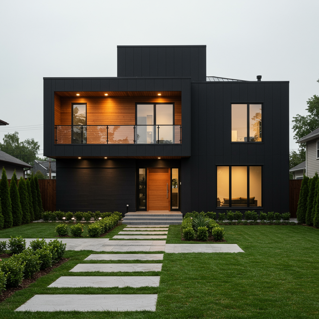 Mostly Metal by Glidden is a striking, dark, cool black with a slight green undertone. McCollum recommends using it for an all-over, monochromatic look on body siding, trim, garage doors, and even matching roof tiles for a modern statement-making exterior.